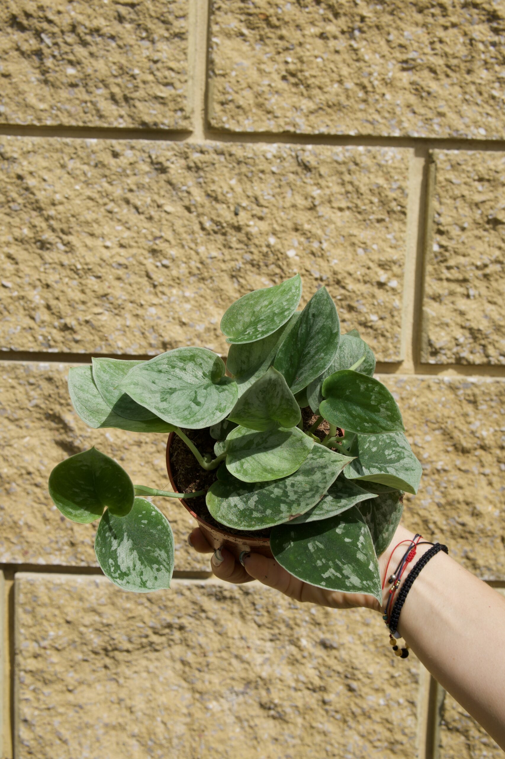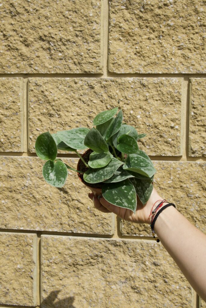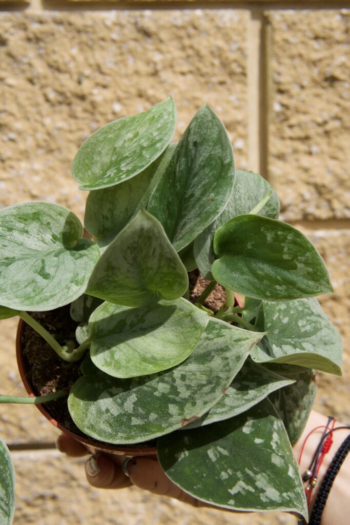 Scindapsus pictus ‘Silvery Ann’ to klasyk o pastelowo-srebrzystych plamach na ciemnozielonych liściach. Dorasta w warunkach pokojowych do ok. 60–90 cm w pionie.