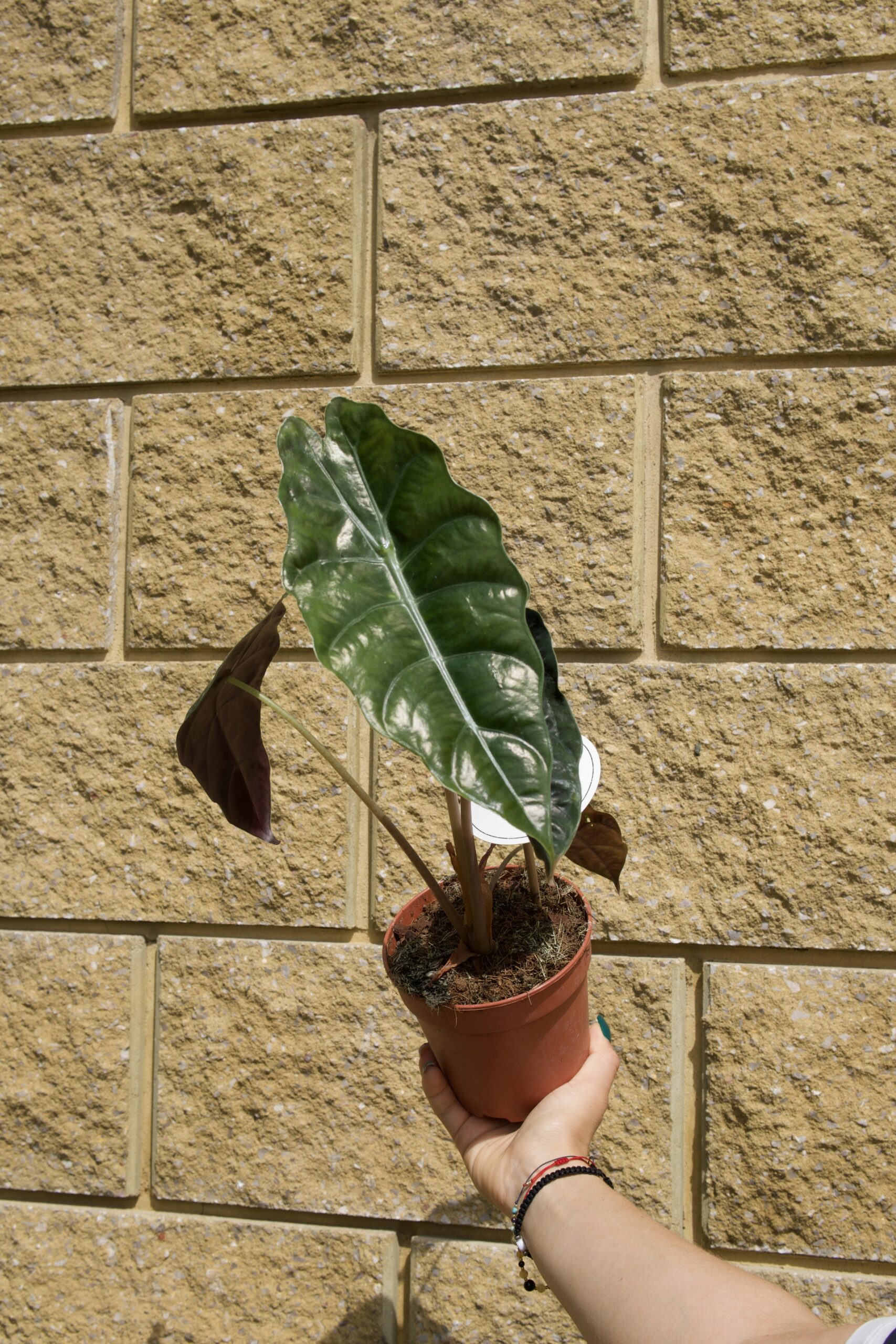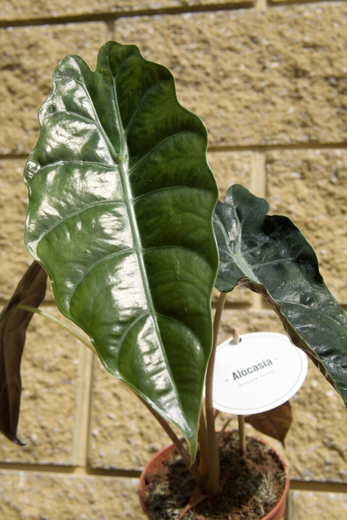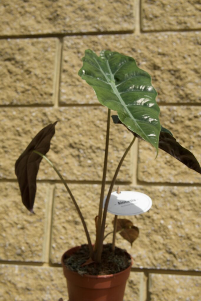 Alocasia Chantrieri to kolekcjonerski rarytas – liście o metalicznym połysku i intensywnym, głębokim zielonym kolorze sprawiają wrażenie "metalicznego lustra". Idealna do wnętrz z klimatem, w których błyszcząca zieleń gra pierwsze skrzypce. Dorasta do oko 40 cm.