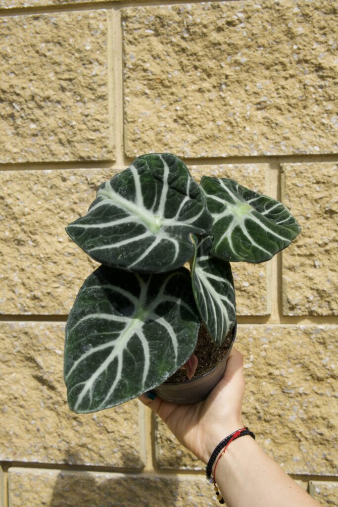 Alocasia Ninja to czarna elegancja w małym formacie – ciemne, aksamitne liście z wyraźnym, śnieżnobiałym unerwieniem nadają jej charakteru jakookienne dzieło sztuki. W domowych warunkach osiąga ok. 20–40 cm wysokości w zależności od pielęgnacji. Roślina pochodzi z Azji Południowo-Wschodniej i wymaga kreatywnych rozwiązań świetlnych, by rozwinąć pełnię urody.