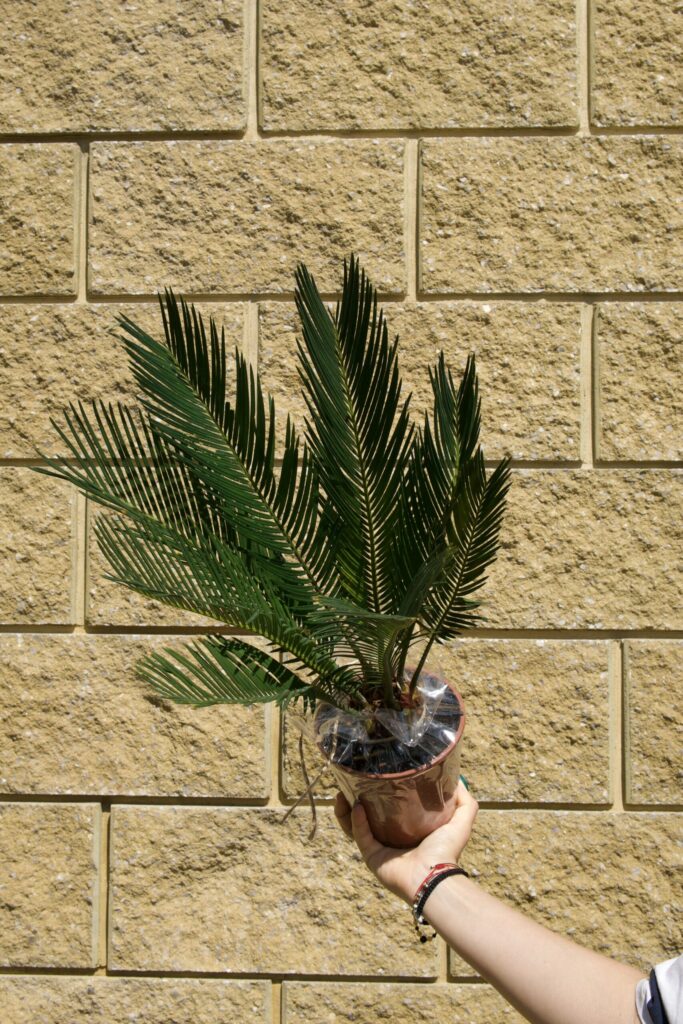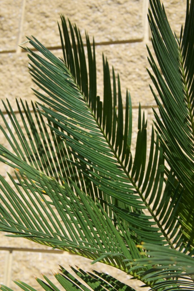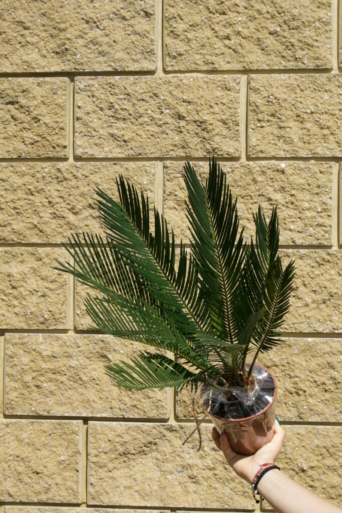 Cycas revoluta, czyli sagowiec, to żywy relikt prehistorii – roślina podobna do palmy, ale znacznie starsza i bardziej odporna. Tworzy symetryczne rozetki sztywnych, pierzastych liści wyrastających z centralnego punktu – każdy liść to subtelna struktura z ostrymi listkami. W doniczce osiąga ok. 30–50 cm.