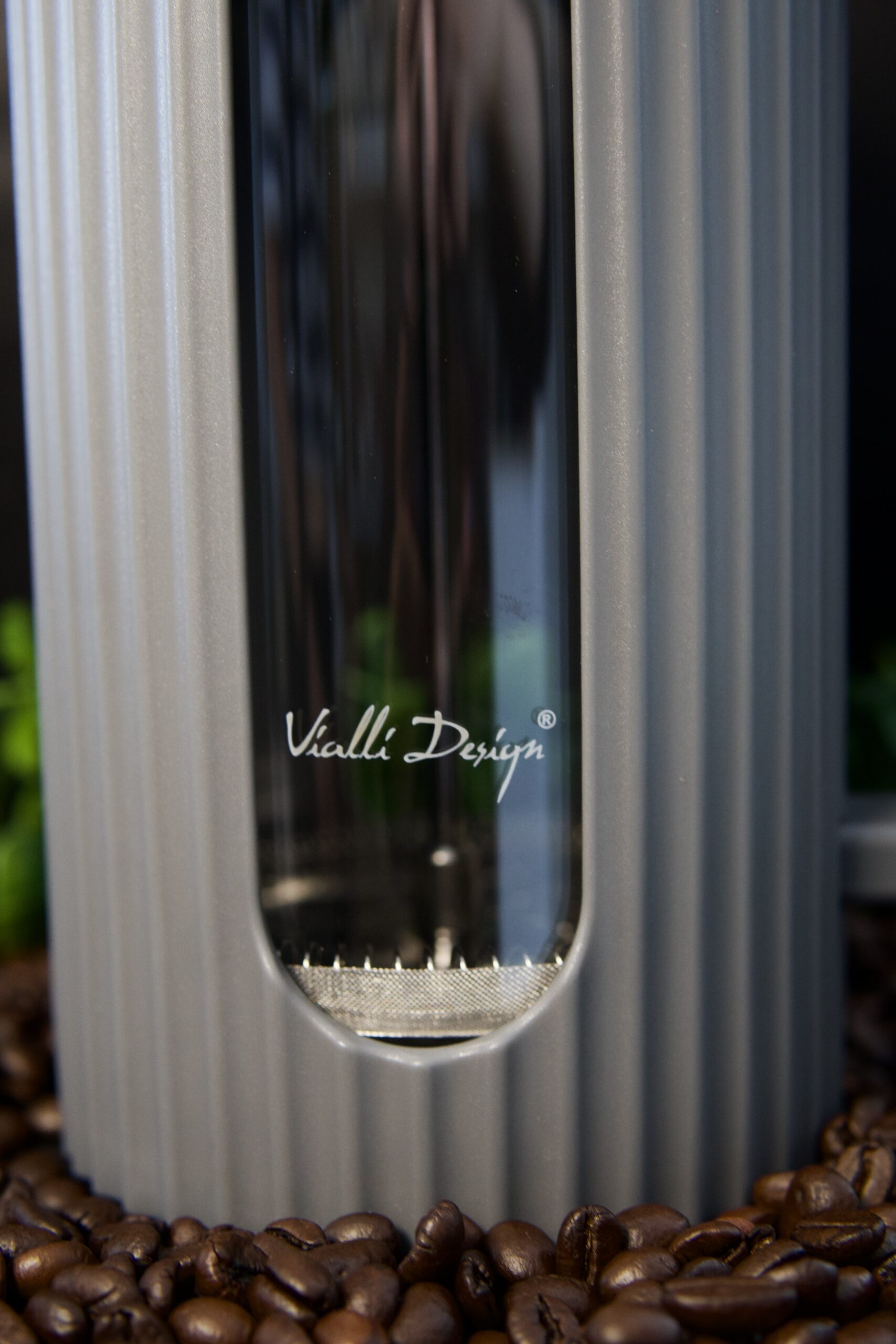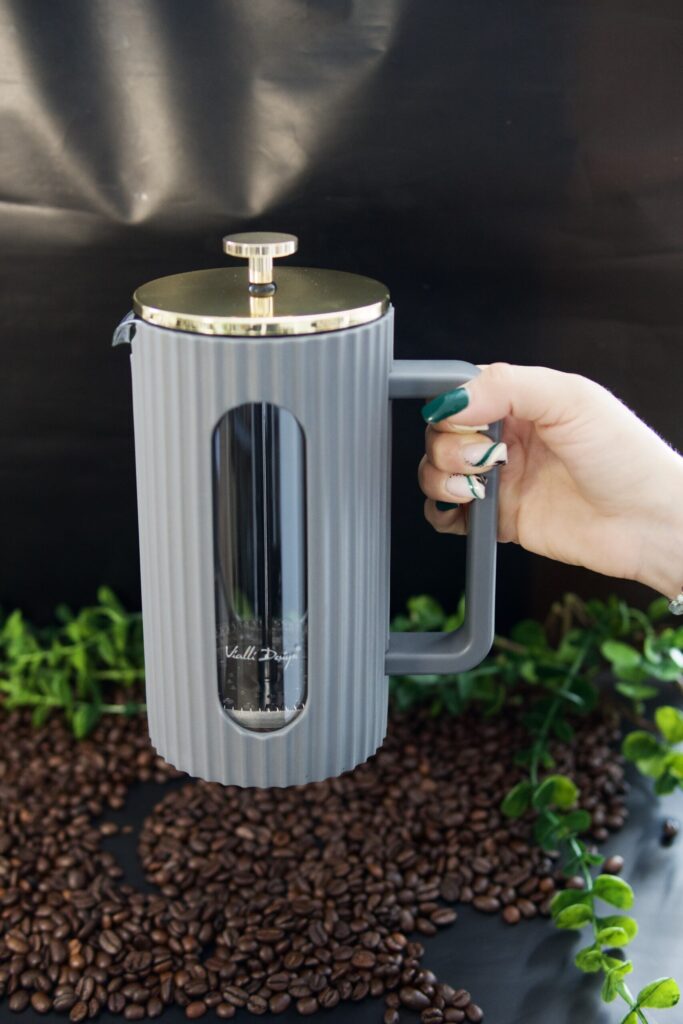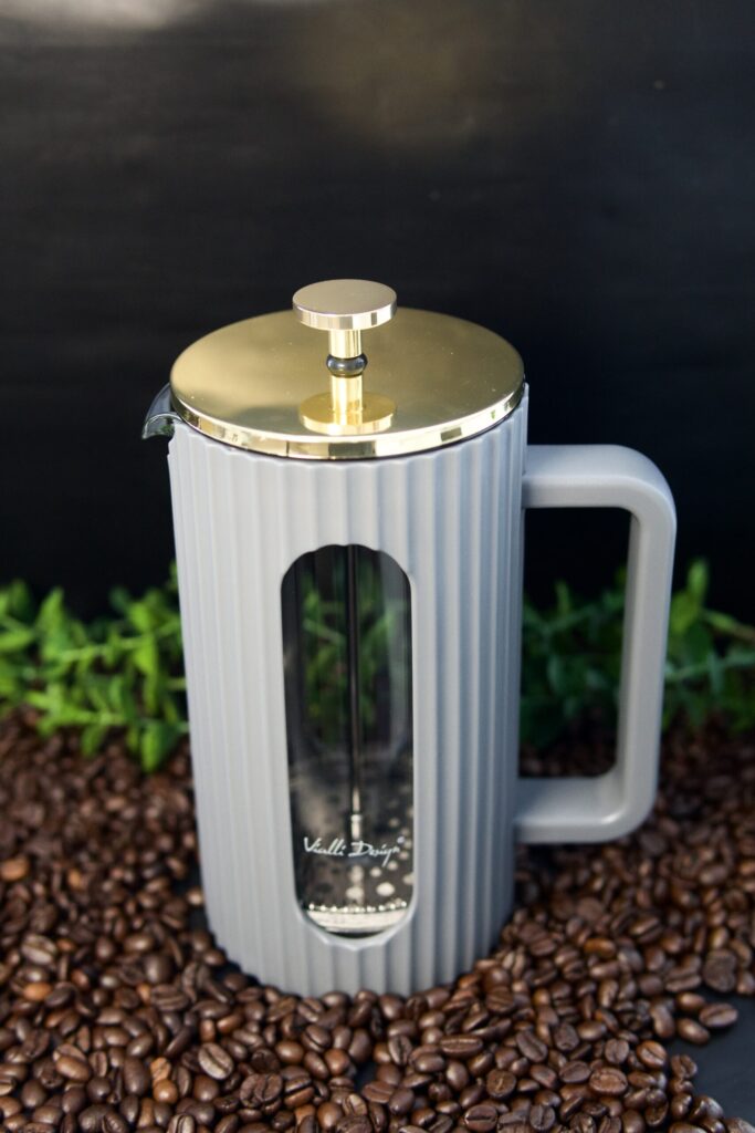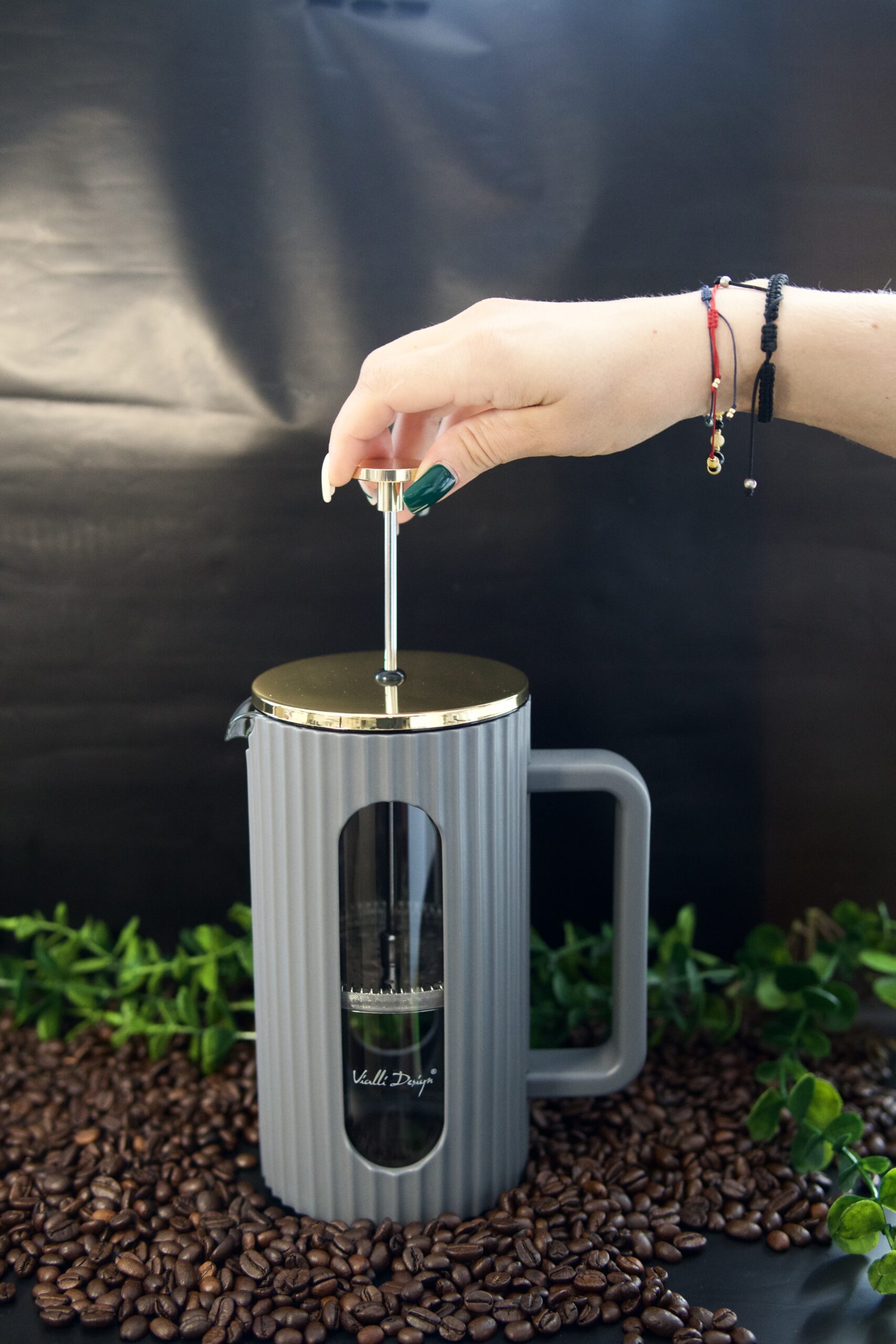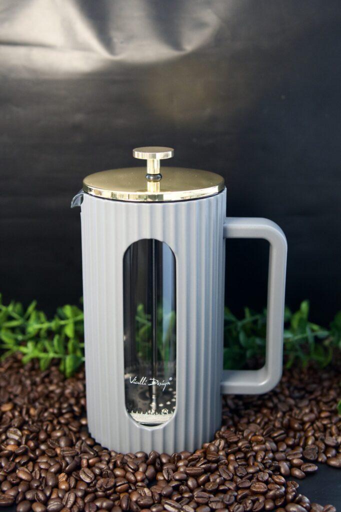 Złoty tłok i pokrywa odbijają poranne światło, a żłobione, szare wykończenie wprowadza harmonię między nowoczesnością a subtelną elegancją. Idealnie sprawdzi się w kuchni estetycznej, ale i w tej pełnej artystycznego nieładu – bo kawa to przecież nie schemat, tylko rytuał.