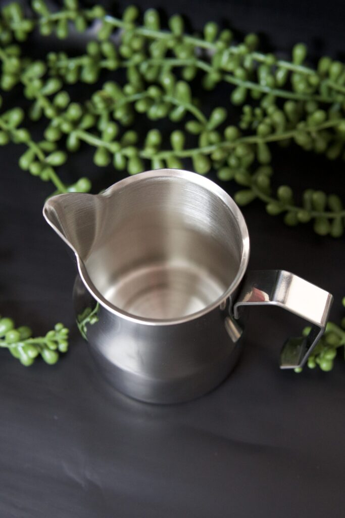 Stalowy dzbanek do spieniania mleka z precyzyjnym dzióbkiem – idealny do latte art i codziennego parzenia kaw mlecznych.