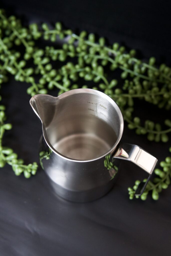 Stalowy dzbanek do spieniania mleka z precyzyjnym dzióbkiem – idealny do latte art i codziennego parzenia kaw mlecznych.