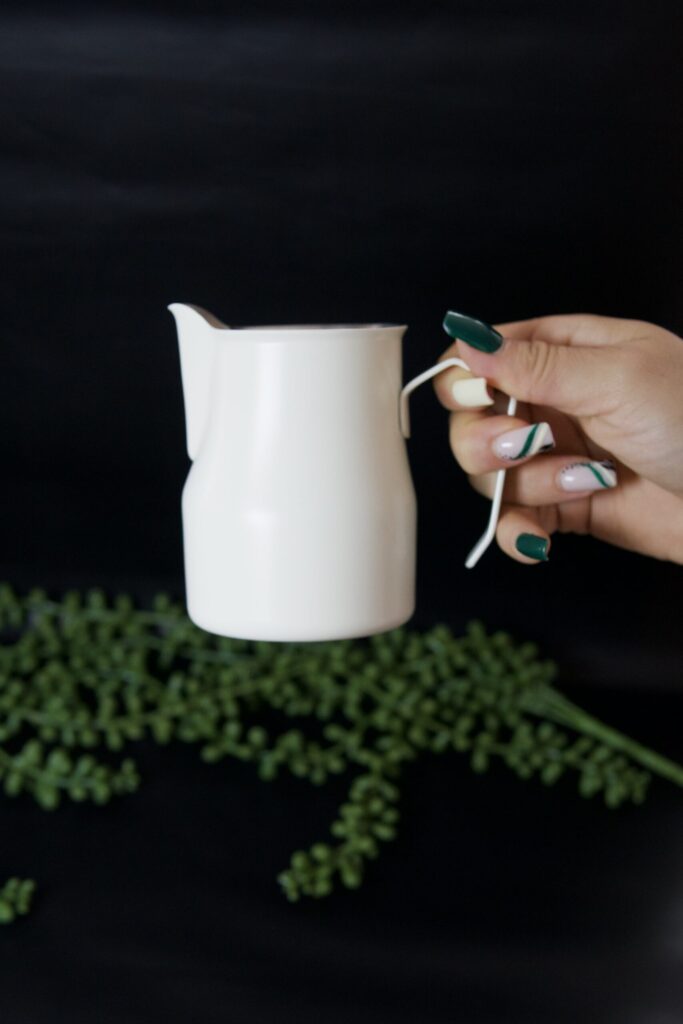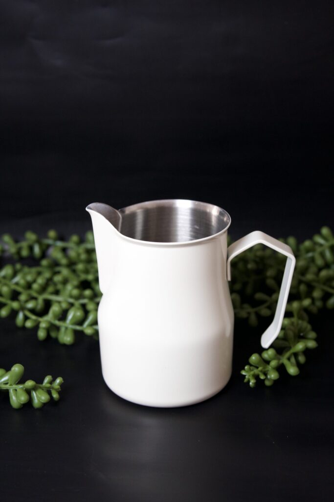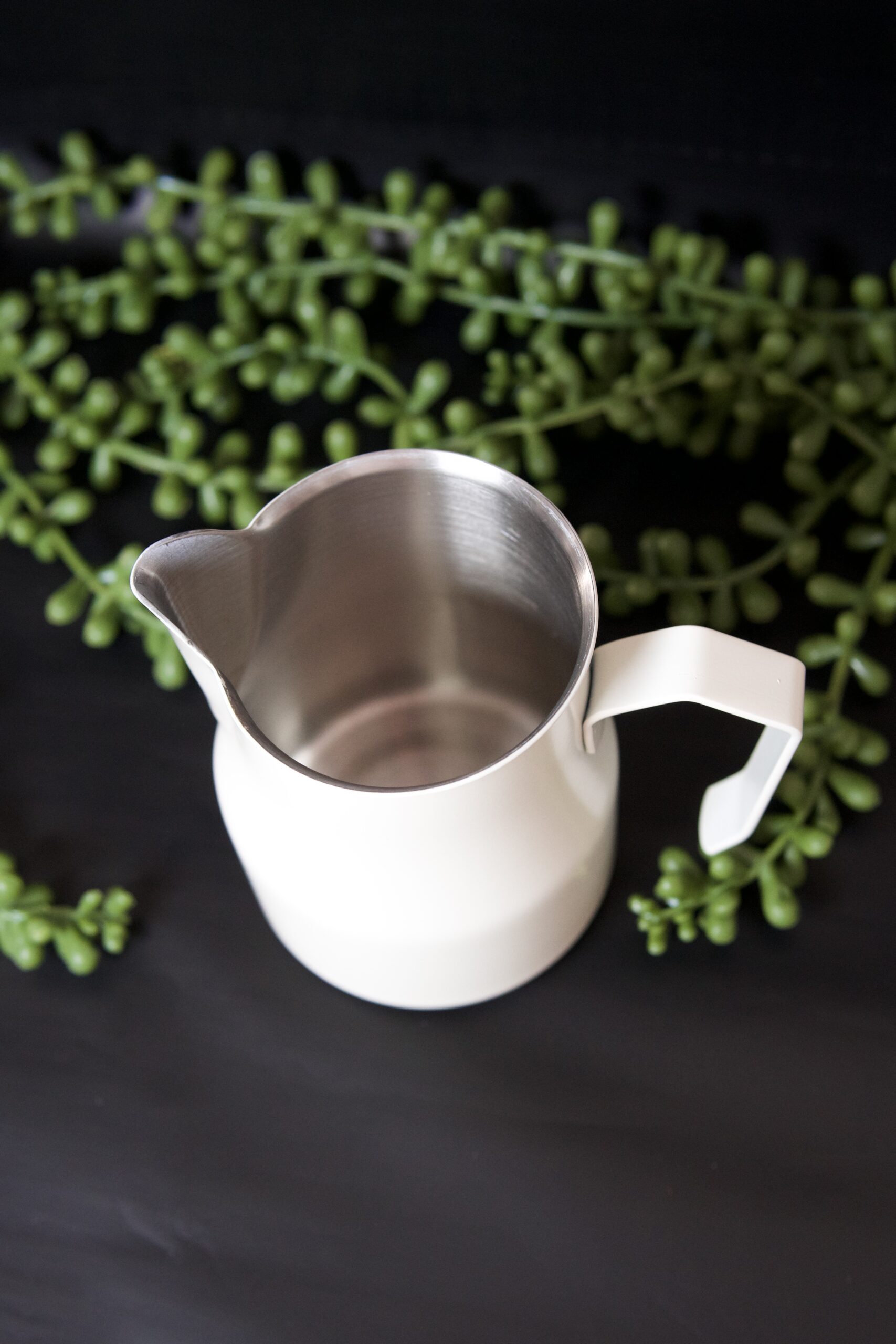 Elegancki dzbanek do spieniania mleka 350 ml w kolorze mlecznej bieli. Minimalistyczny design, idealny do porannej kawy i latte art.