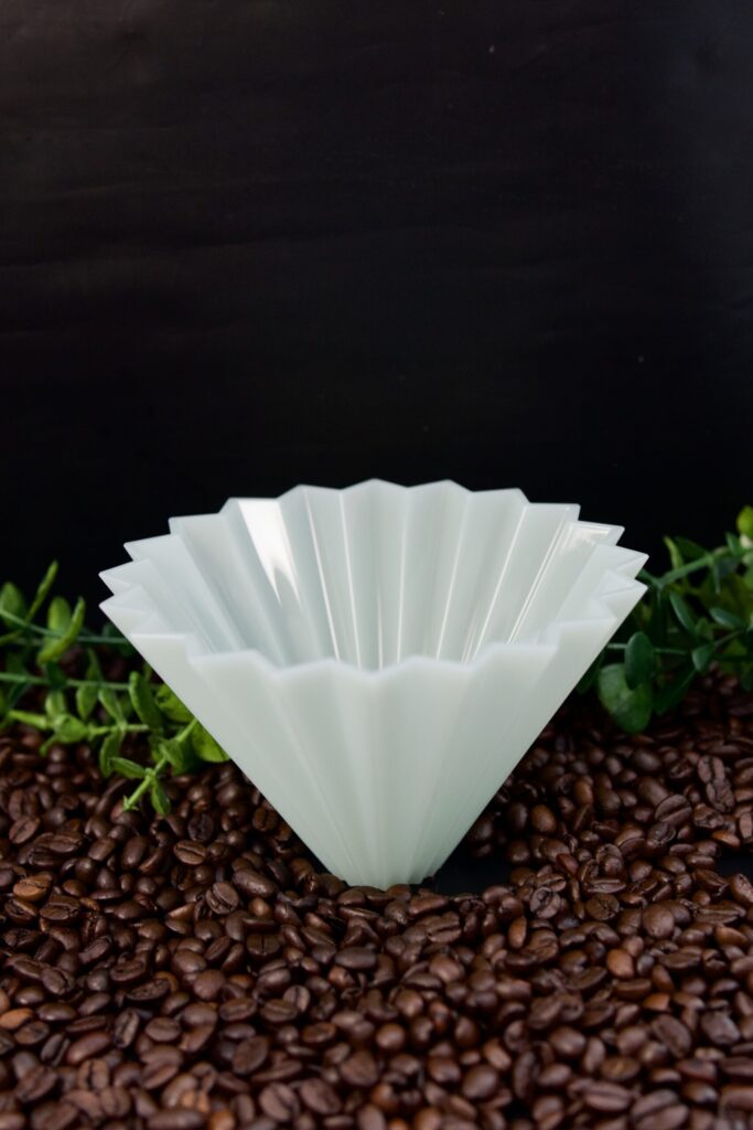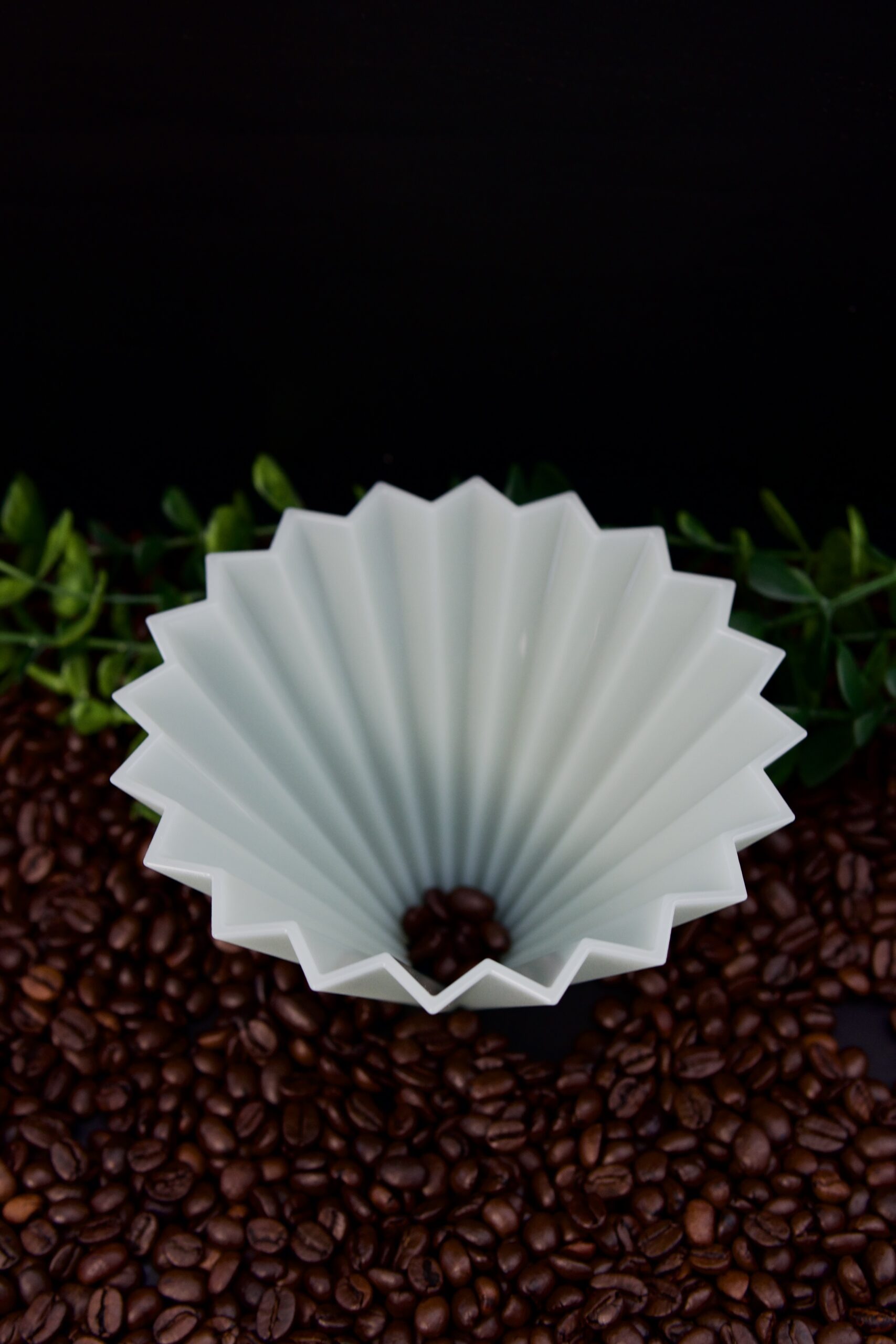 Lśniący dripper Origami Air M w kolorze białym – lekki, efektowny i stworzony do rytuału przelewu. Połączenie japońskiej precyzji z nowoczesną formą.