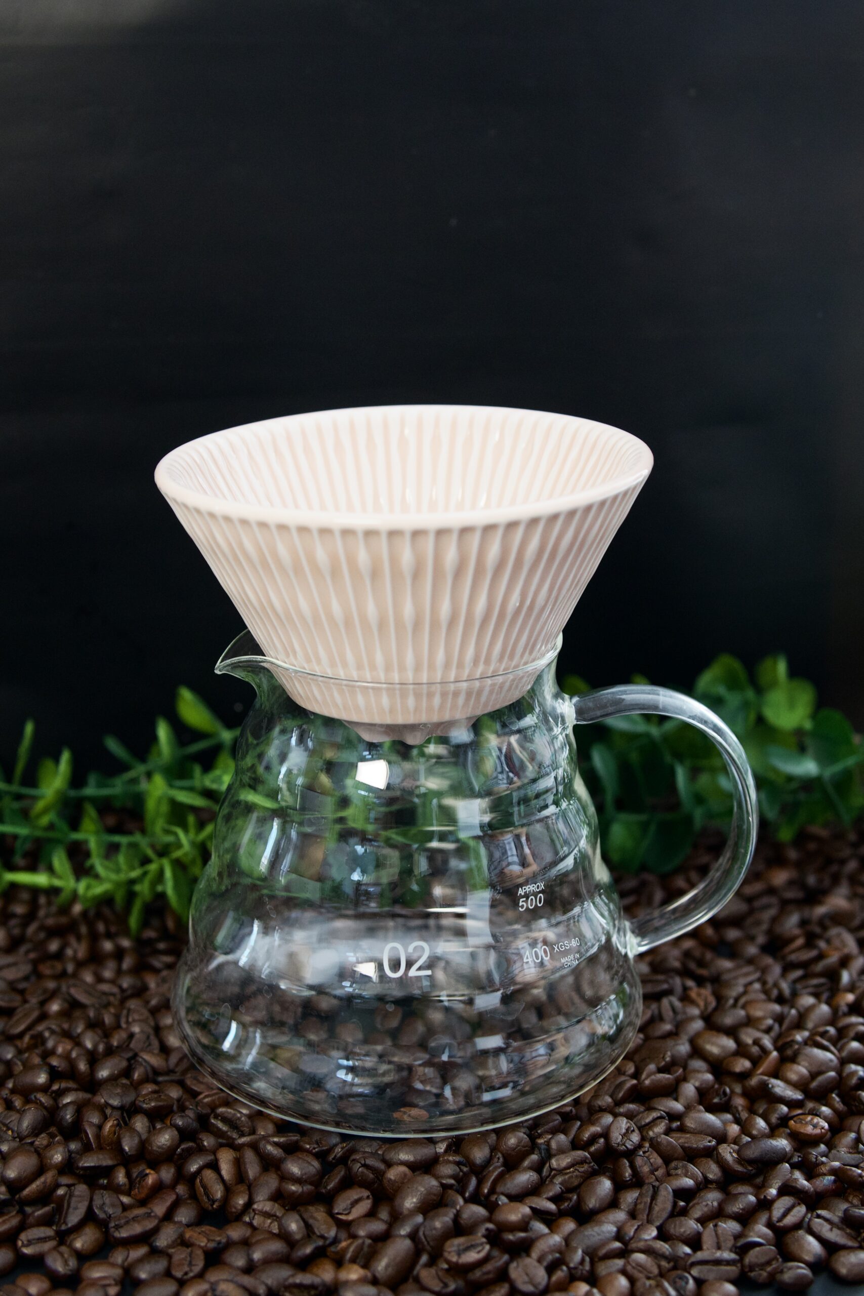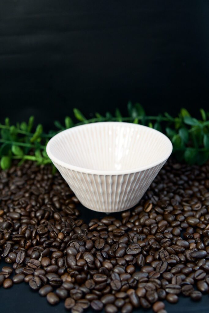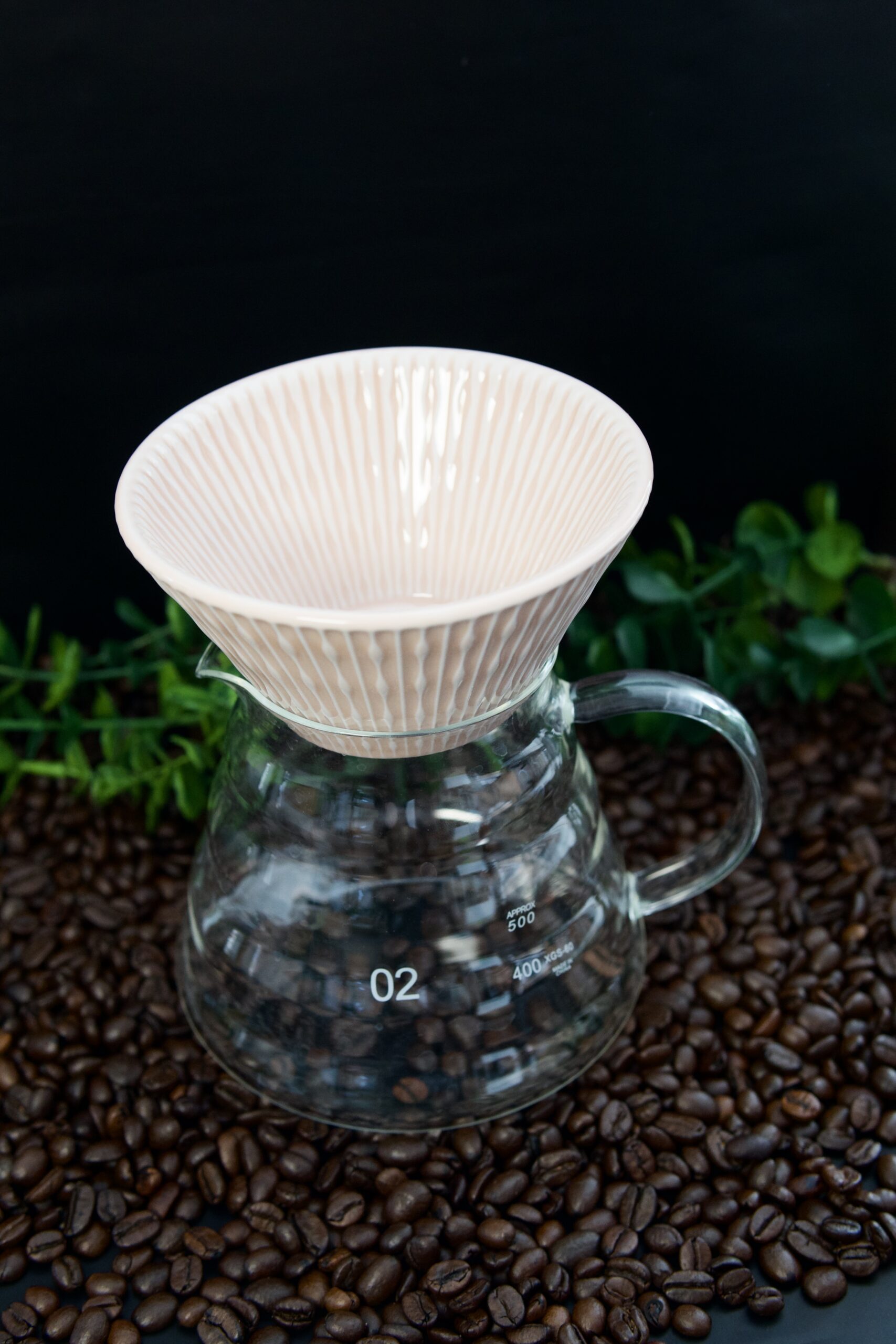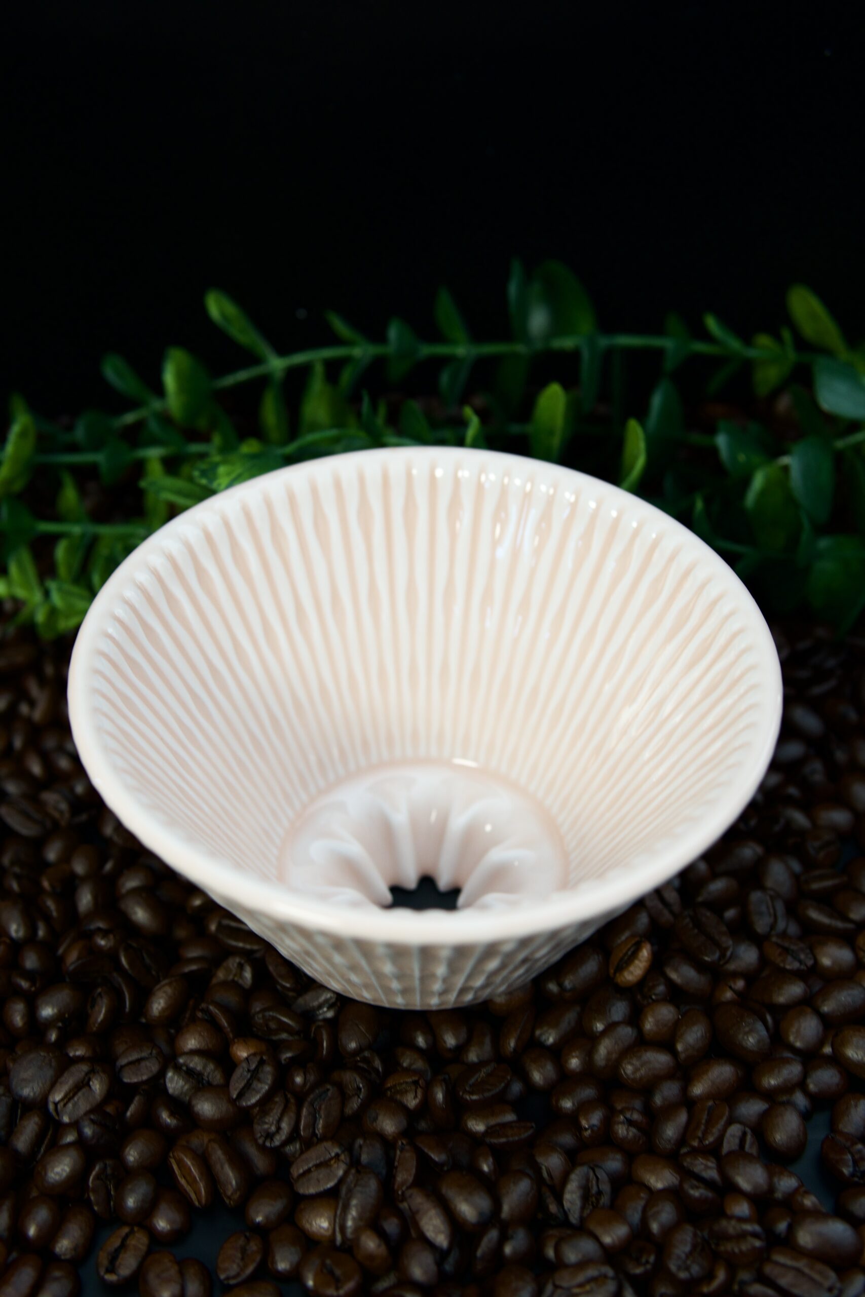 Ten dripper wygląda jak zrobiony z ciszy. Jego pudrowy odcień różu koi zmysły, a żłobienia prowadzą wodę tak, jak my prowadzimy gościa przez rytuał parzenia – z uważnością, spokojem i sercem.