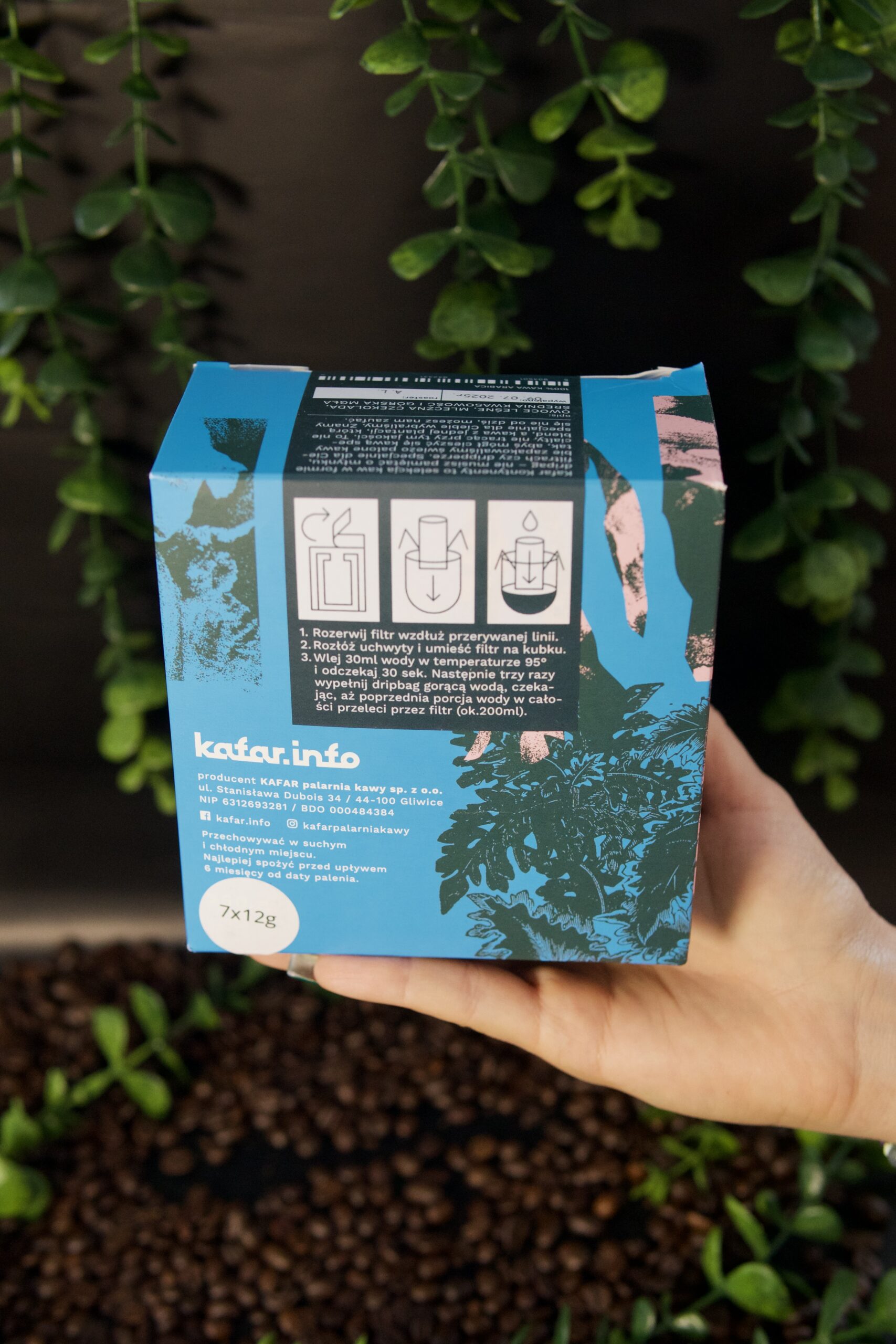 Drip bag Kafar Ameryka to gotowe do zaparzenia saszetki z jasno paloną arabiką z Ameryki Środkowej lub Południowej. Kiedy brakuje czasu, miejsca lub ekspresu – zostaje kubek, wrzątek i ta saszetka. Idealna na biwak, pociąg, uczelnię albo spokojny poranek w łóżku. To kawa, która nie potrzebuje sceny – wystarczy chwila.