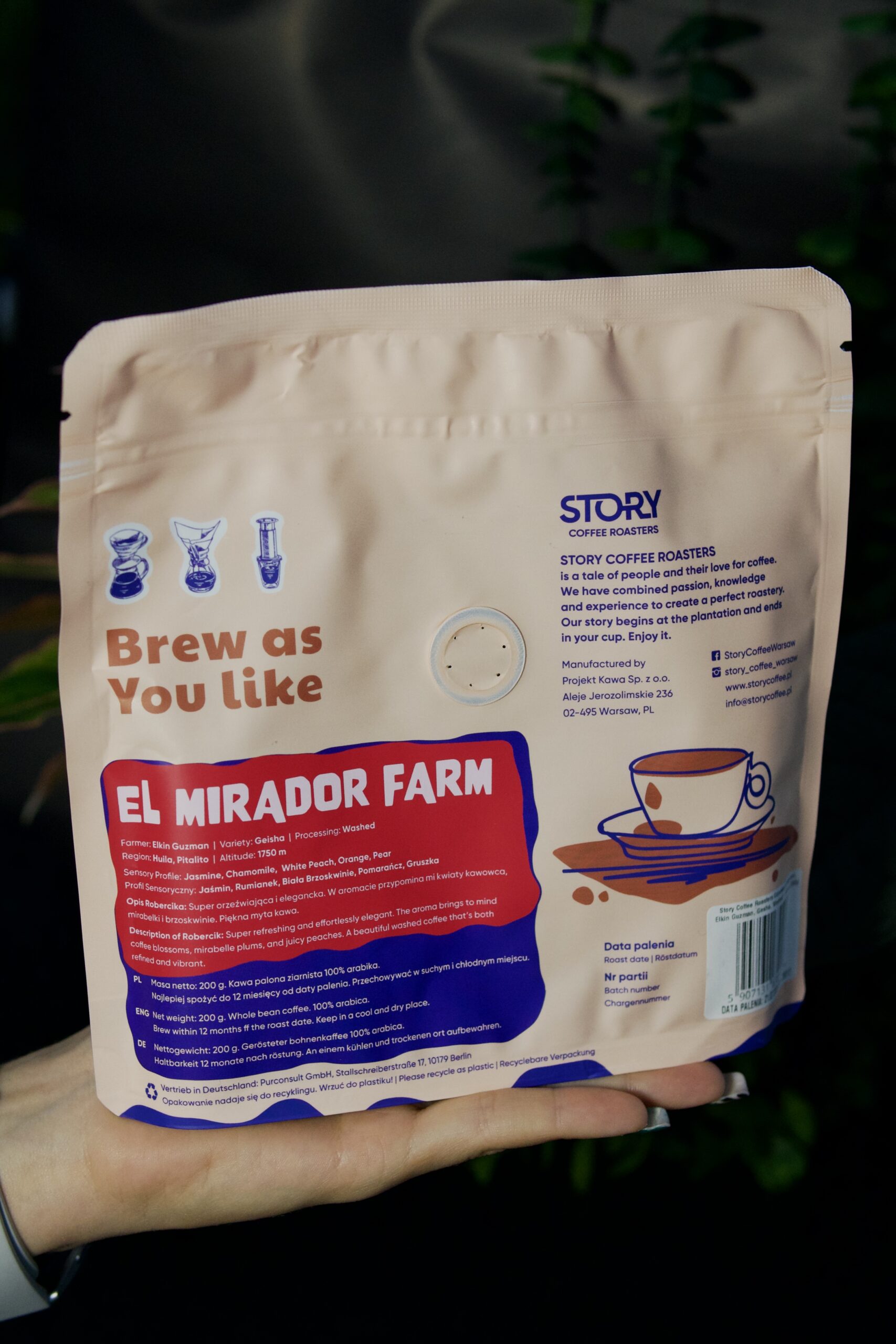 Pochodzi z farmy Elkina Guzmana w kolumbijskim regionie Huila, gdzie wszystko – od gleby po selekcję wiśni – podporządkowane jest jakości. To Gesha, która nie potrzebuje eksperymentów. Wystarczy klasyczna obróbka myta, by rozwinęła się jak herbata kwitnąca w szklance.