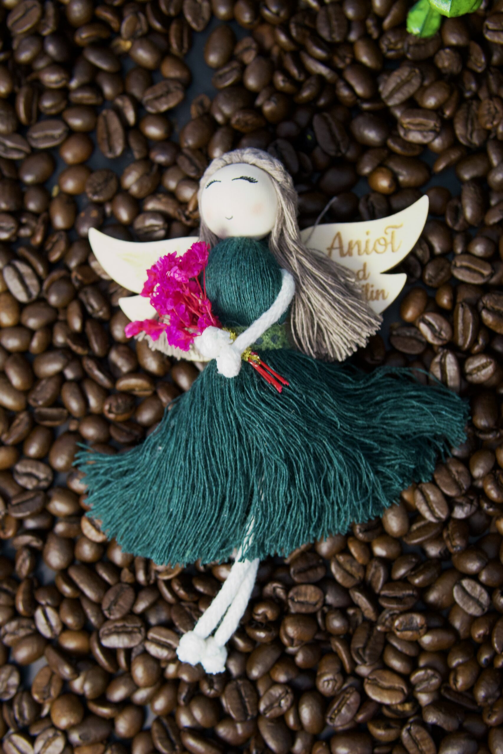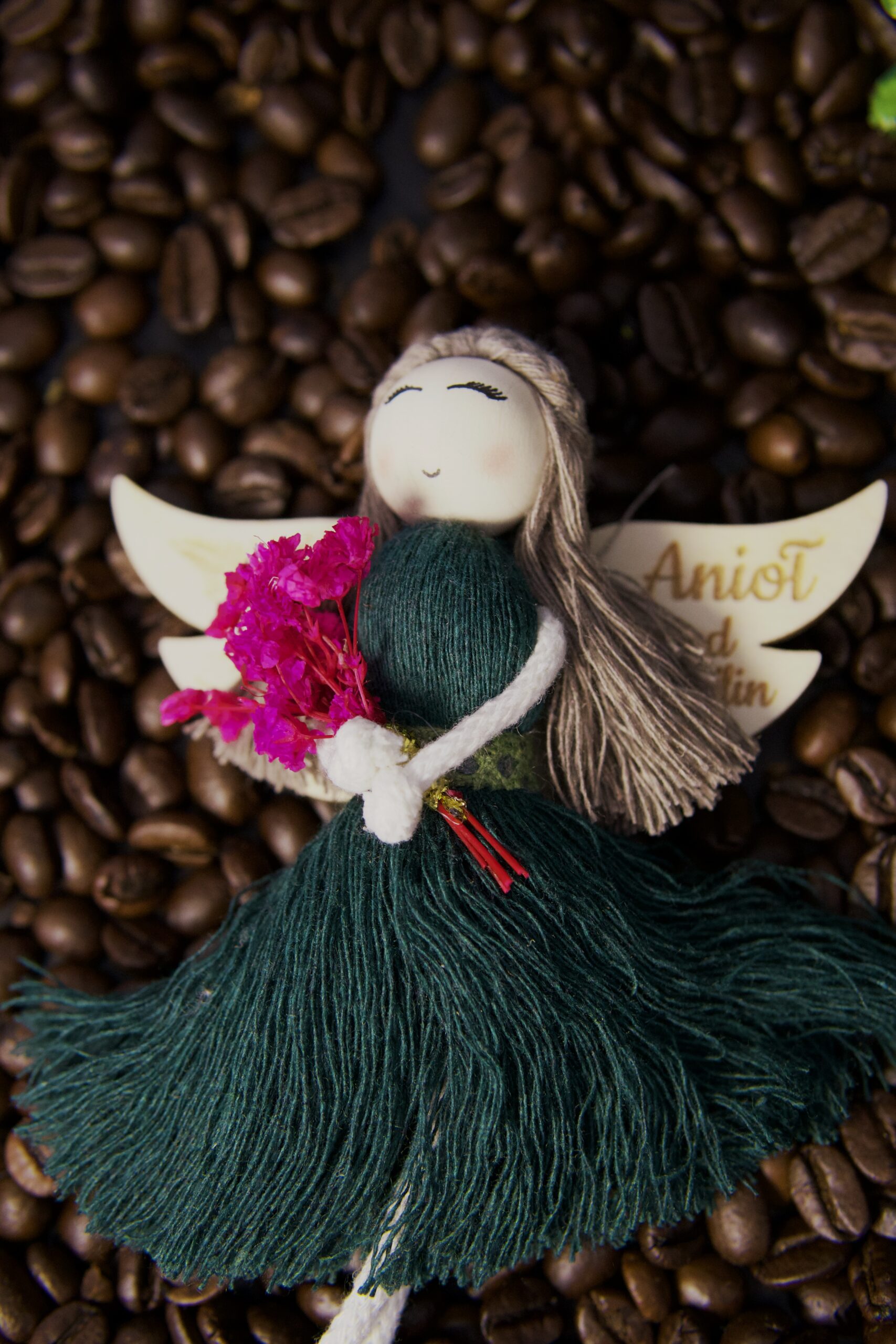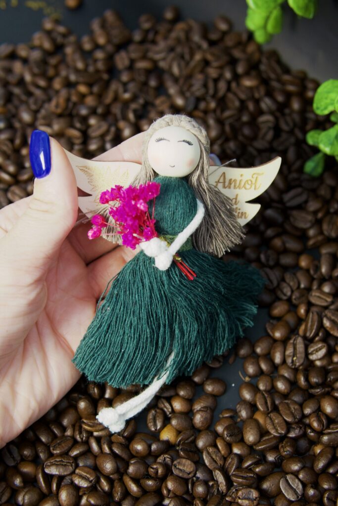 „Anioł od Roślin” w butelkowej zieleni to opowieść o harmonii z naturą. W dłoniach trzyma mini bukiecik suszonych roślin – jak wspomnienie spaceru po dzikiej łące, gdy powietrze pachnie świeżością, a czas płynie wolniej. Zawieszony w ulubionym miejscu staje się strażnikiem spokoju i dobrej energii, przypominając, że bliskość natury jest najlepszym lekarstwem dla duszy.