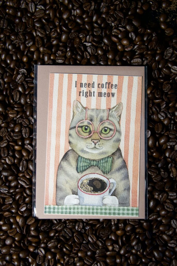 Świetna jako dodatek do kawowego upominku, kartka do przyjaciela lub dekoracja na ścianę. Bo sztuka też może mruczeć.