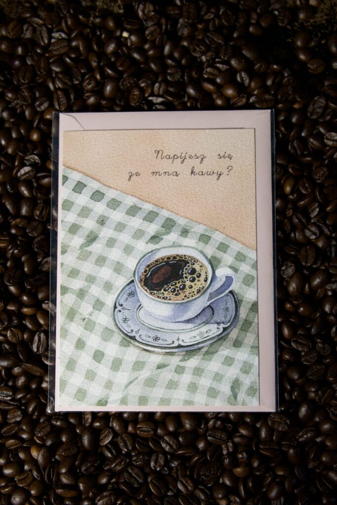 „Napijesz się ze mną kawy?” to delikatna kartka z ilustracją filiżanki – ciepła, subtelna, poruszająca. To więcej niż pytanie – to wyznanie, zaproszenie do rozmowy, bycia razem, dzielenia codzienności. Dla kogoś ważnego – by poczuł się zaproszony do świata, który budujesz kawałek po kawałku.