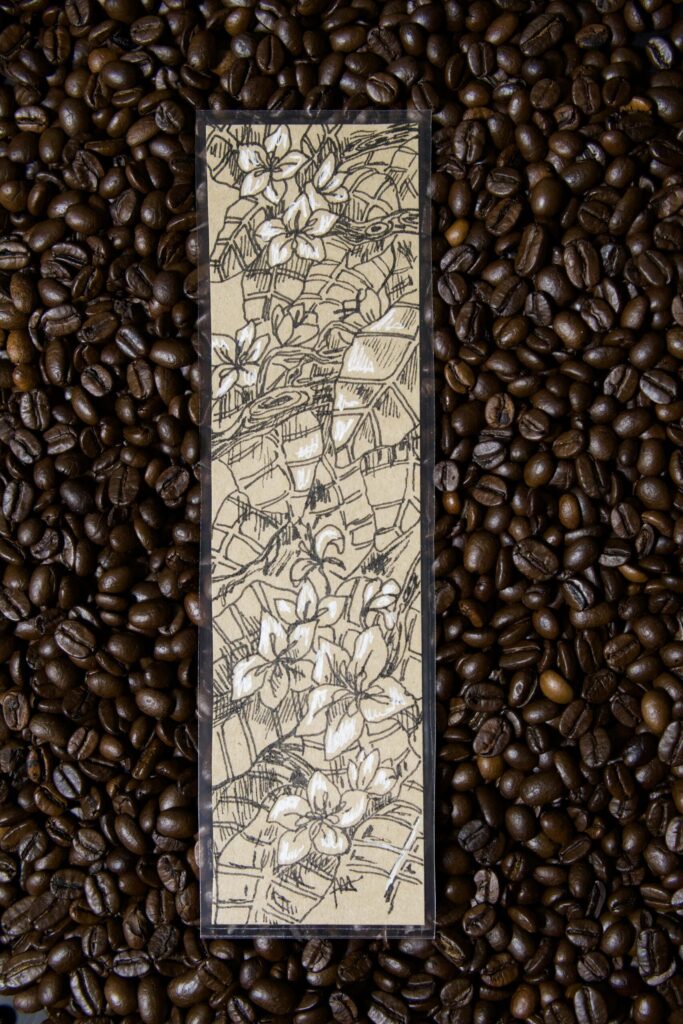 Zakładka z delikatnym rysunkiem kwiatów kawy – symbolem wzrostu i codziennej magii natury. Powstała na ekologicznym papierze z recyklingu.