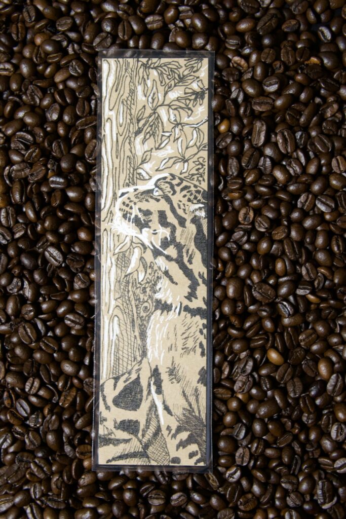 Zakładka z ilustracją pantery mglistej. Powstała na ekologicznym papierze z recyklingu, łącząc sztukę, naturę i symbolikę dzikiego kota.