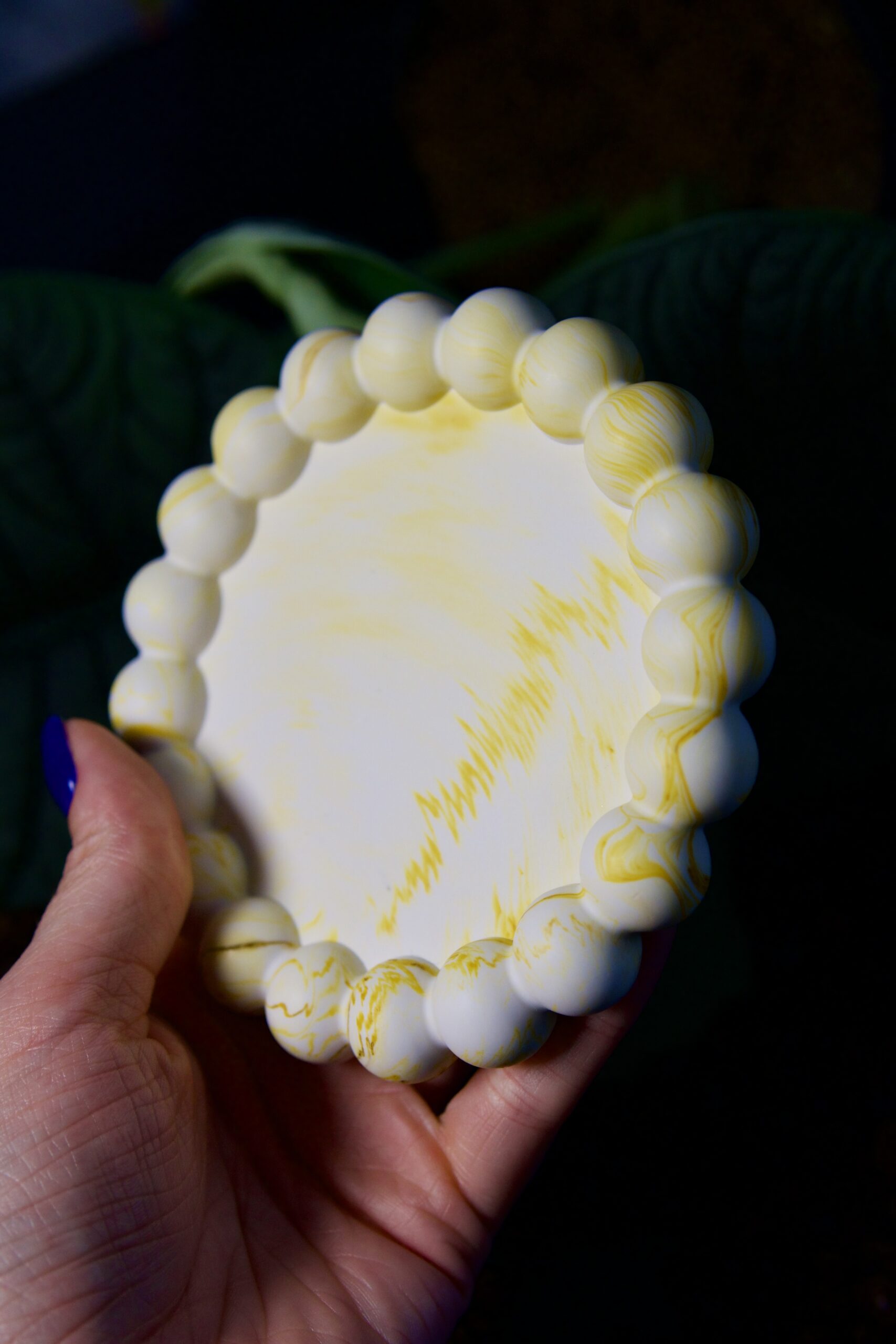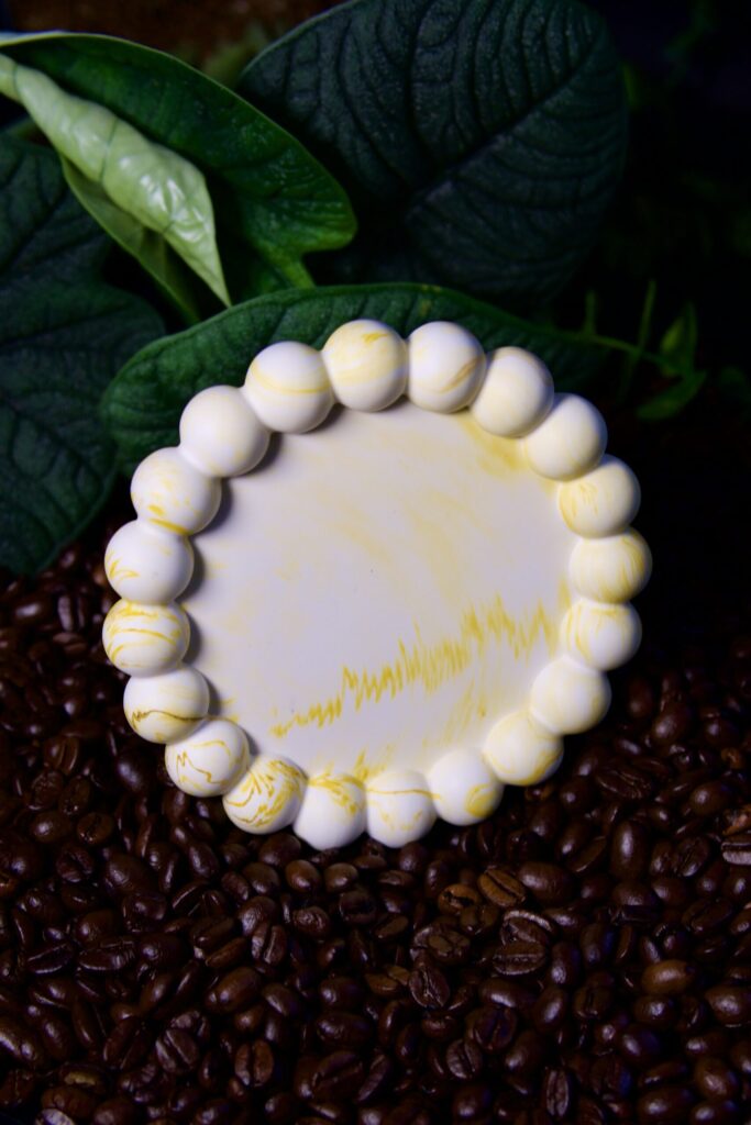 Pastelowo-żółta podstawka „Bubble” to odrobina słońca zamknięta w rękodziele – idealna pod świecę, pierścionek lub mały rytuał codzienności.