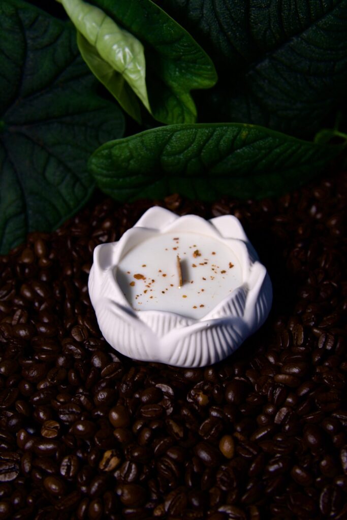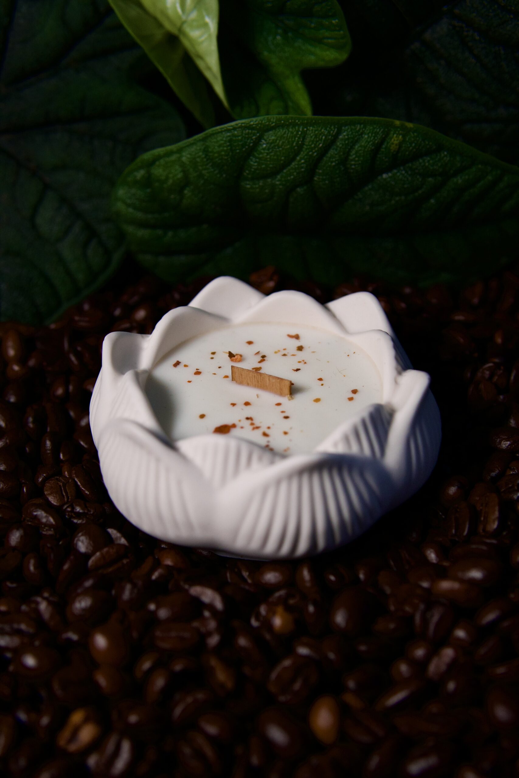 Subtelna świeca w kształcie lotosu, pachnąca różanym prosecco. Minimalistyczna forma, mlecznobiała barwa i zapach chwili wytchnienia.