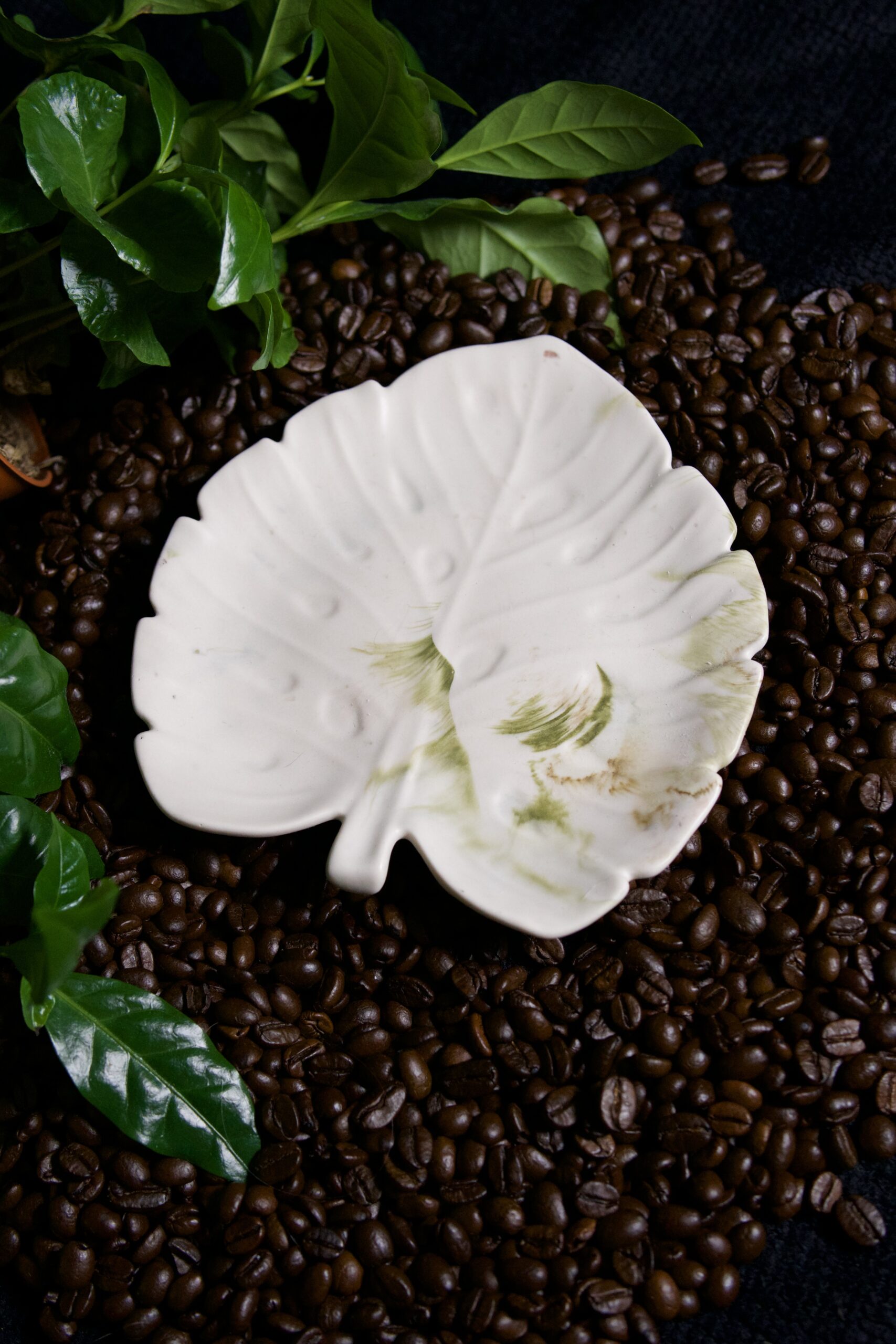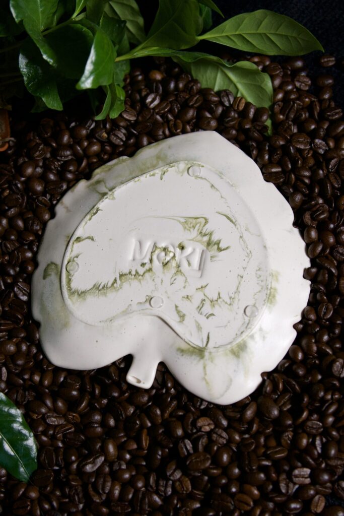Limitowana edycja podstawki w kształcie liścia monstery z zielono-brązowym marmurkiem. Ręcznie wykonany odlew – jak kawałek lasu, zamknięty w formie.