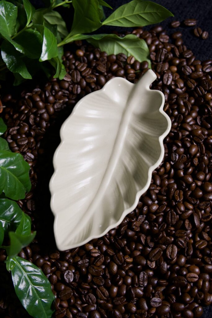 Subtelna podstawka w kształcie liścia w roślinnej zieleni. Ręcznie tworzona – delikatna, unikalna, idealna na biżuterię, klucze lub wspomnienia.