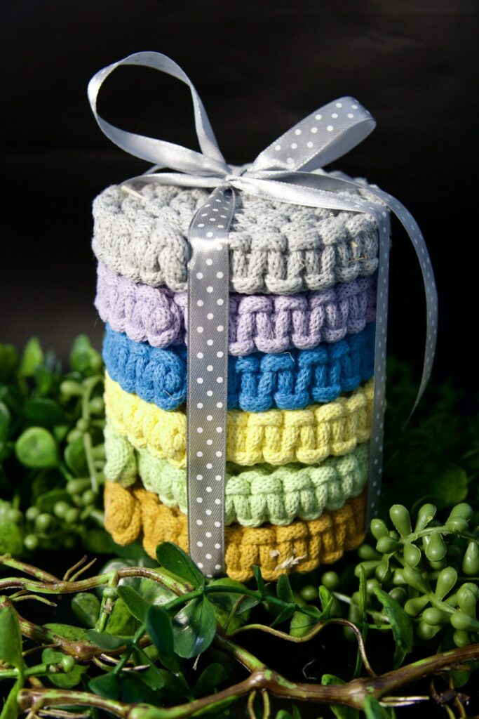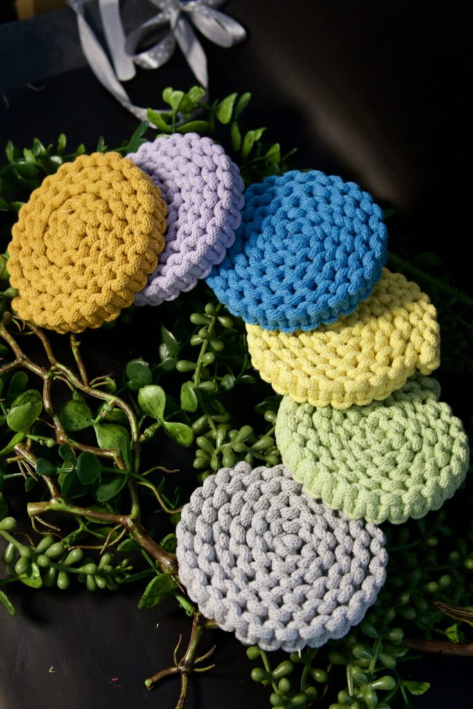 Makramowy splot łączy sześć nasyconych kolorów – jak paleta emocji. Niech te podkładki będą Twoim codziennym przypomnieniem, że warto żyć kolorowo, z lekkością i czułością wobec prostych momentów.